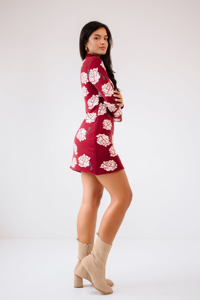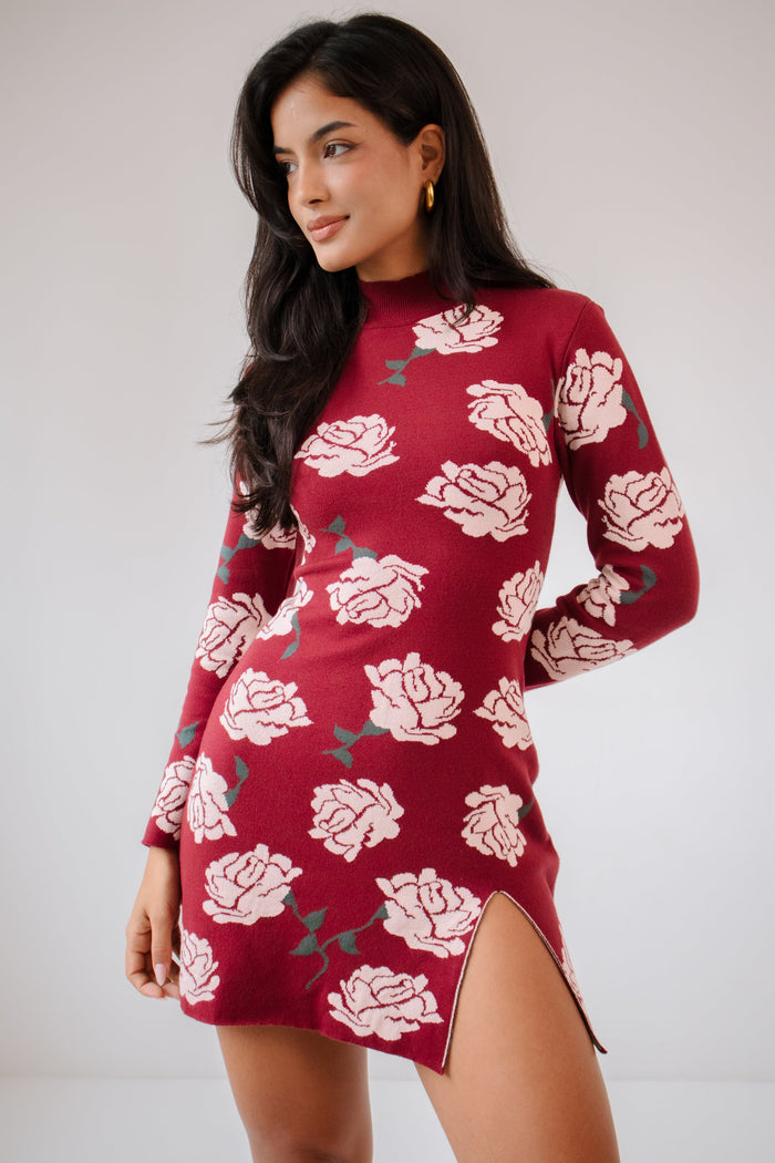 O já clássico Vestido Ester em uma nova cor, sempre sexy: seu must-have! De mangas compridas, um tricot com jacquard des roses, ele tem aquele toque aconchegante. A fenda: uh-la-la ! É para atrair todos os olhares, mesmo… Depois não diz que não avisamos!