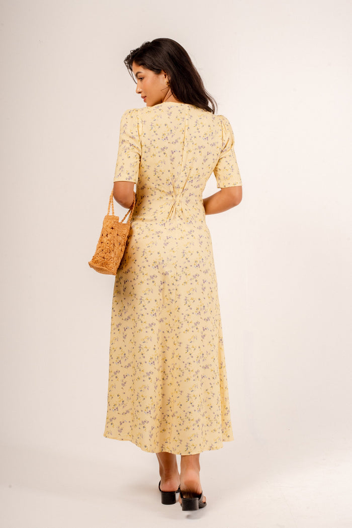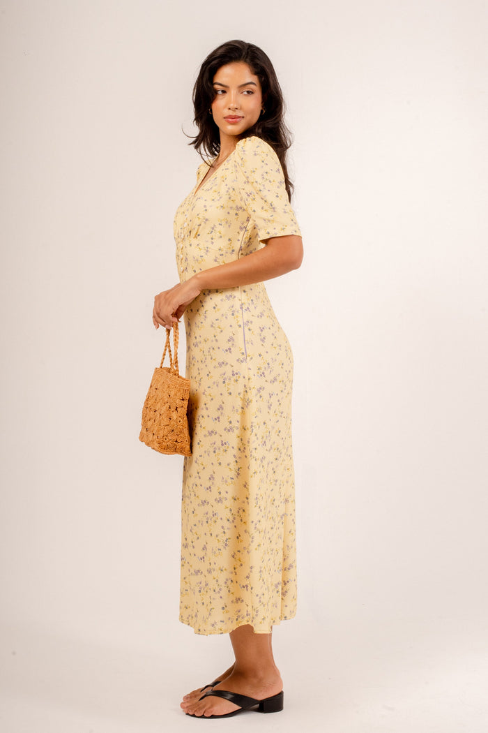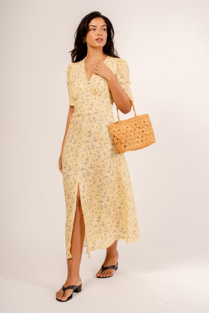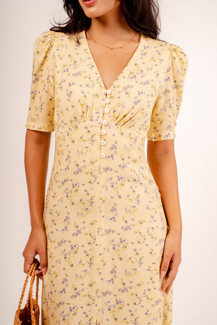 Clássico e feminino! O Vestido Inês tem um charmoso busto em V com abotoamento, mangas levemente bufantes e o grand finale: fenda frontal! Adoramos a leveza que ele tem e o jeito que seu caminhar também fica leve. Em uma edição especial, com o frescor da nossa estampa de lavanda!
